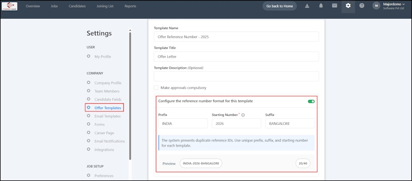 You need to enable the Configure the reference number format for this template option when creating or editing an offer letter template under Settings > Offer Templates.