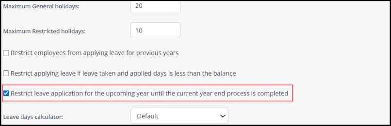 Once enabled, employees won’t be able to apply for leave until the leave year-end process is completed.